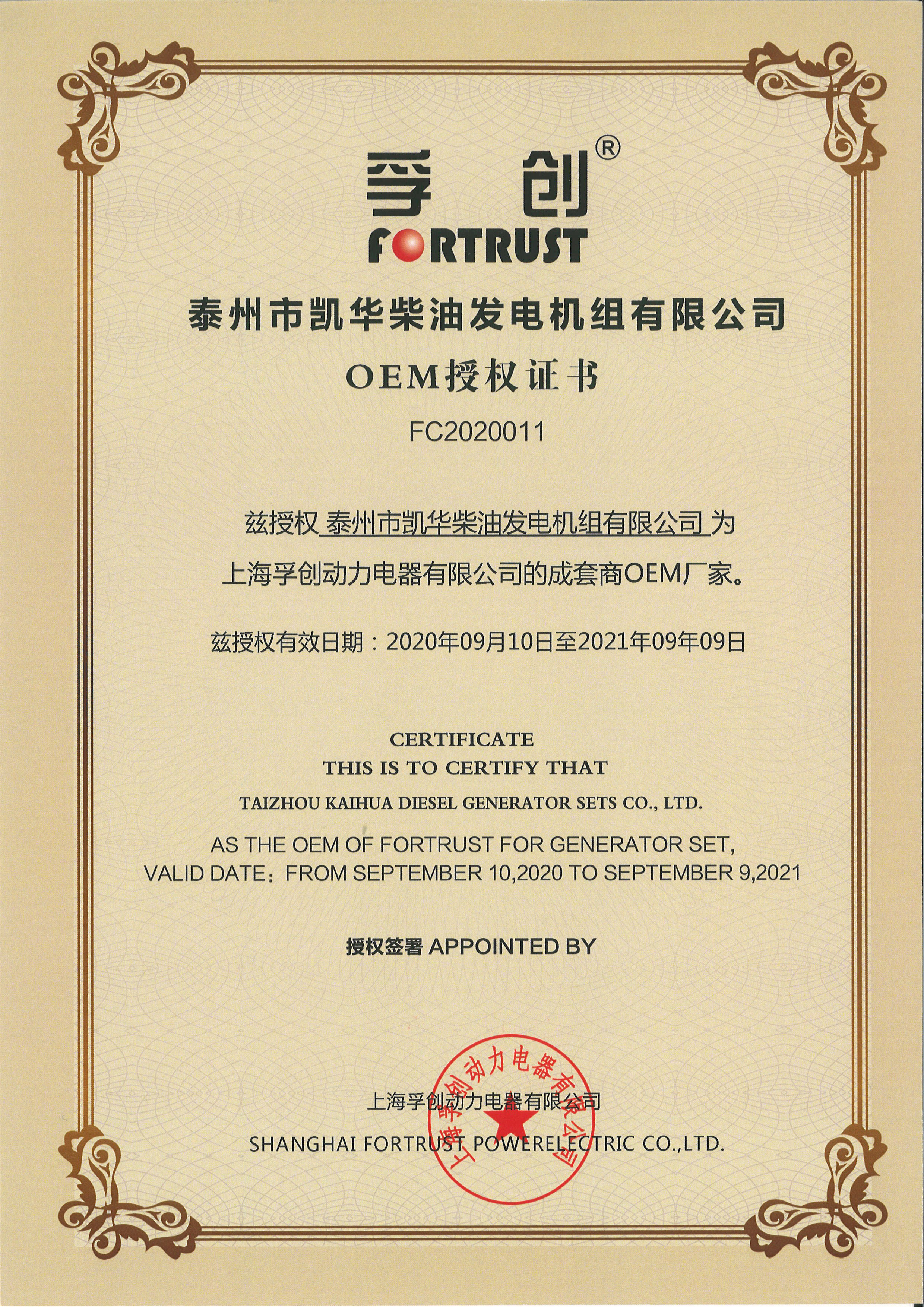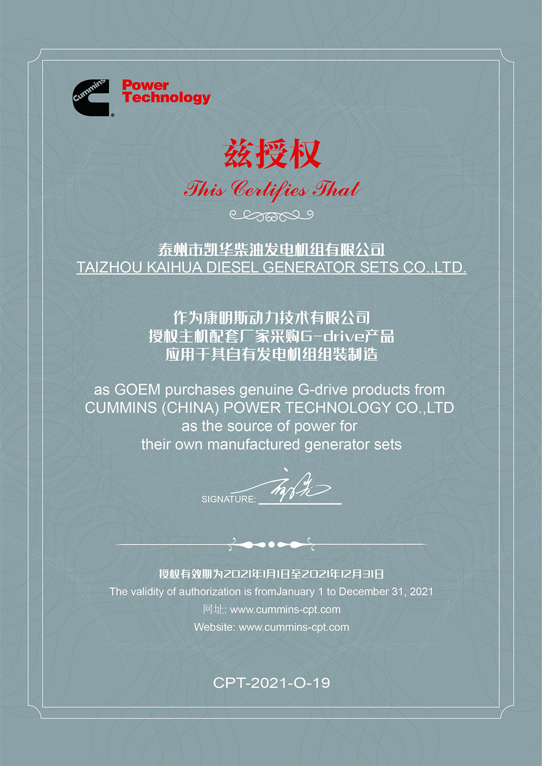 泰州市凱華柴油發電機組有限公司創建于2003年,是一家集柴油發電機組燃氣發電機組的研發、生產、銷售為一體的高新技術民營企業,公司座落于“漢唐古郡,淮海名區”,具有“鳳凰城”美稱的祥泰之州——江蘇省泰州市,地處中國經濟最發達的長三角經濟圈,水陸空立體交通,地理位置十分優越。公司目前注冊資本金11800萬元人民幣,生產基地占地六十畝,現有各類高素質員工一百多名,專業技術人員達46人,其中高級技術人員16人,年銷售額近6億元。 公司主營產品:3~3000KW陸用柴油發電機組,15~600KW移動拖車電站,12~1000KW船用應急柴油發電機組,各種靜音型、中高壓、多機并聯、燃氣等特種機組以及進口系列柴油發電機組,可滿足不同客戶的一切電力需求,還可滿足用戶不同電壓、不同頻率的要求。凱華公司是康明斯品牌的授權代理商,專業生產供應康明斯柴油發電機組。